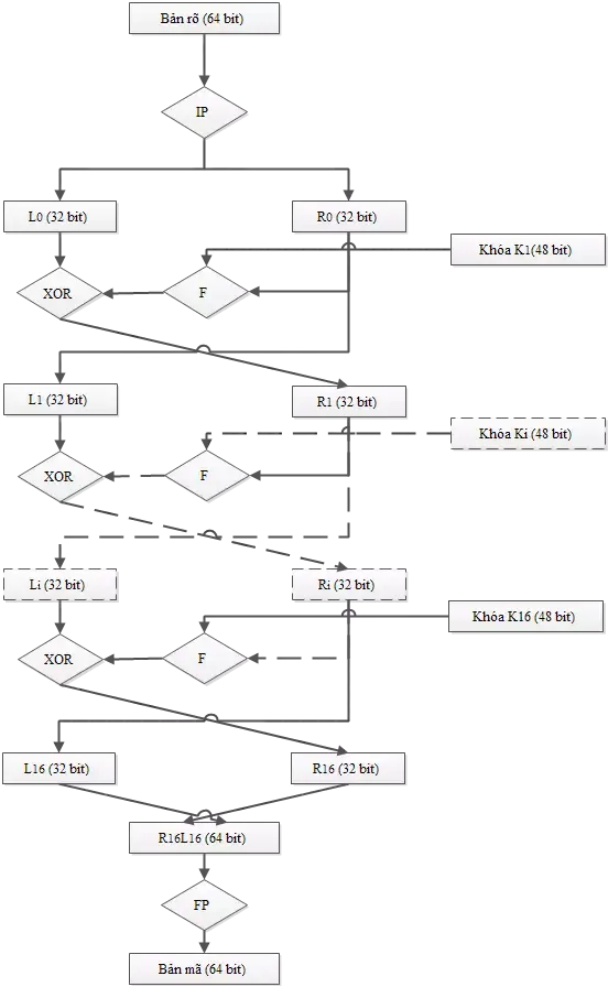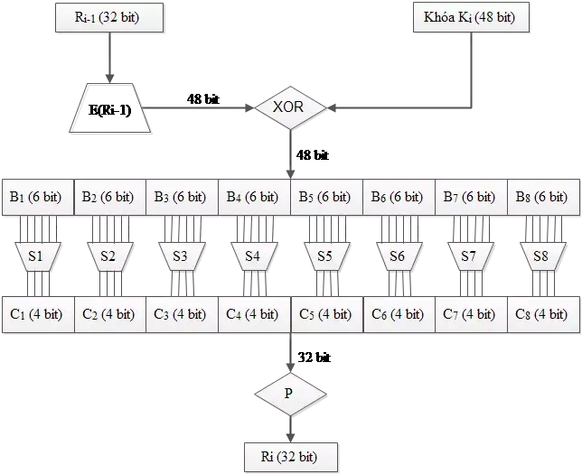 trong đó, $f(R_{i-1}, K_i) = R(S(E(R_{i-1}) \oplus K_i))$ (phần này sẽ được trình bày chi tiết sau).