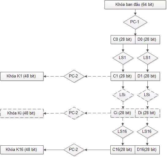- Bước 1: Sinh khóa con: sử dụng thuật toán sinh khóa con từ khóa