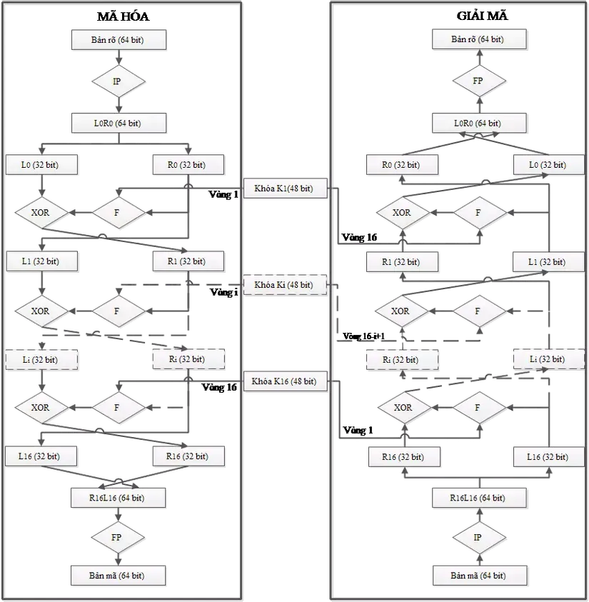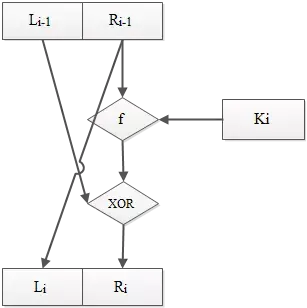 \[L_i = R_{i-1}, \ \ \ R_i = L_{i-1} \oplus f(R_{i-1},K_i)\]Với $K_i$ là khóa được sinh ra ở quá trình tạo khóa, $f$ là một hàm sẽ được trình bày ở sau.