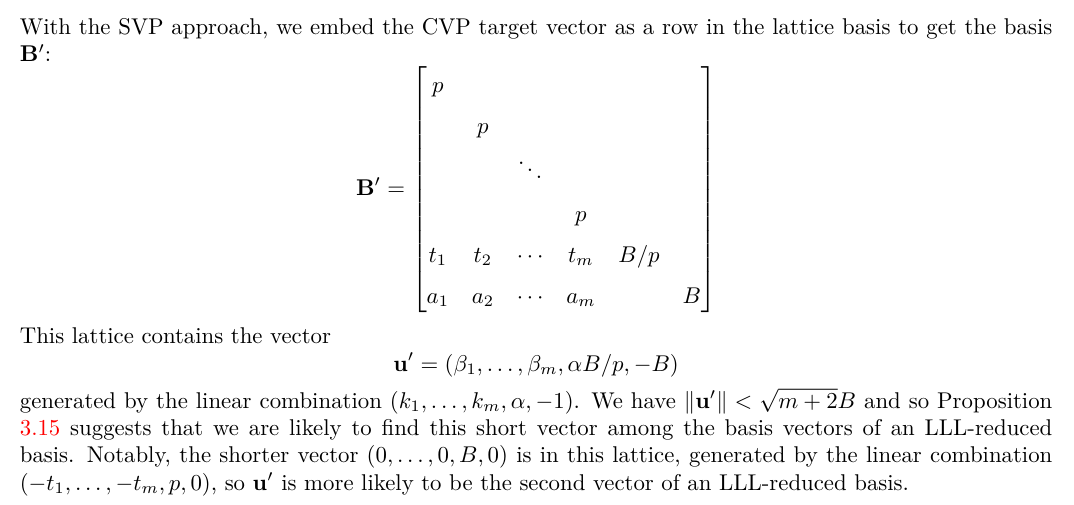 \[t_i\alpha = z_i + e_i \pmod p \\ \Rightarrow e_i - t_i\alpha + z_i = 0 \pmod p\]Với $e_i \leq threshold = (p » k + 1)$. Cách mình xây dựng ma trận là như này: